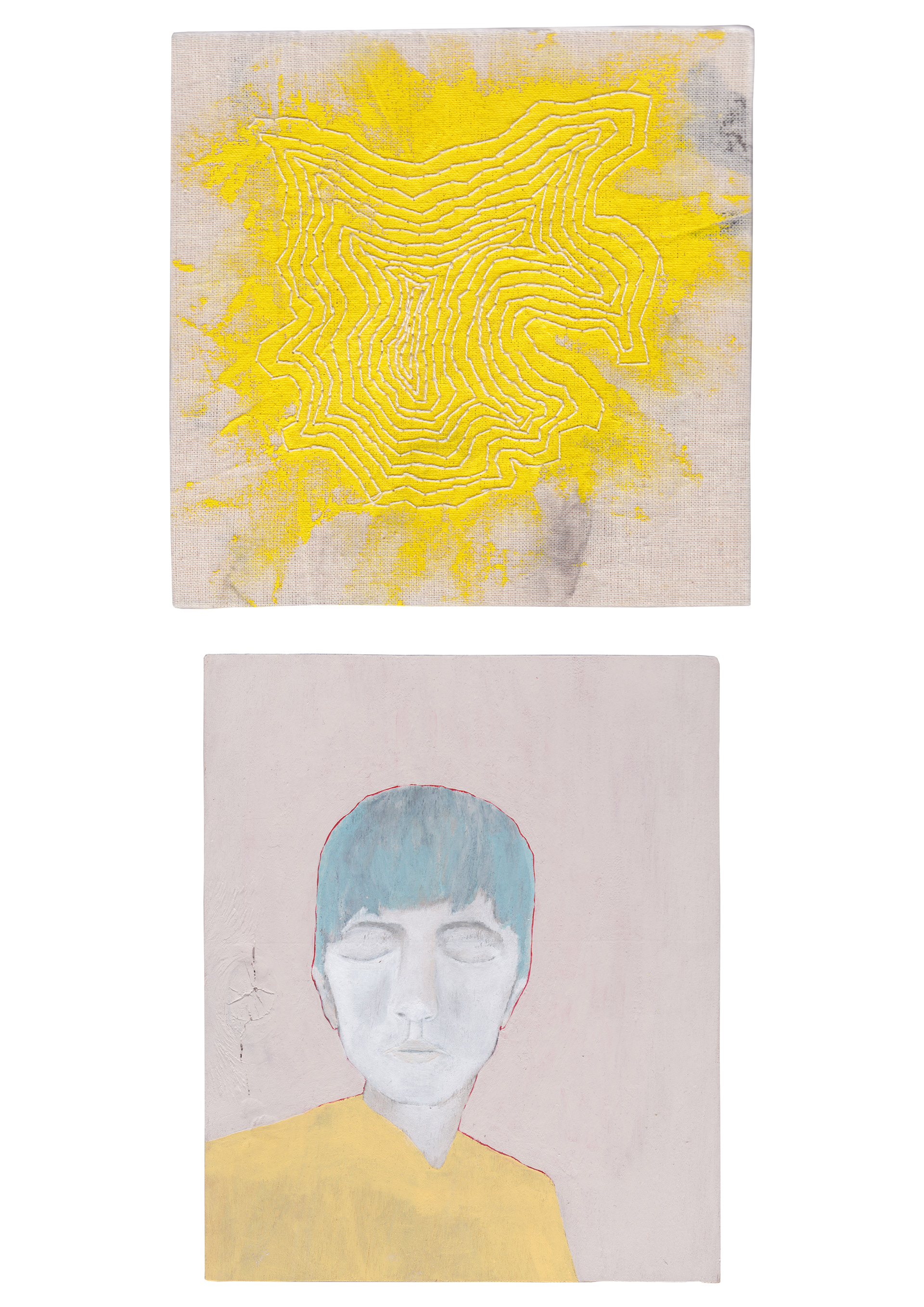 Zelfportret 'Kracht' 2020 - Borduurwerk op geverfd doek, gespannen op hout, potlood en verf op resthout.