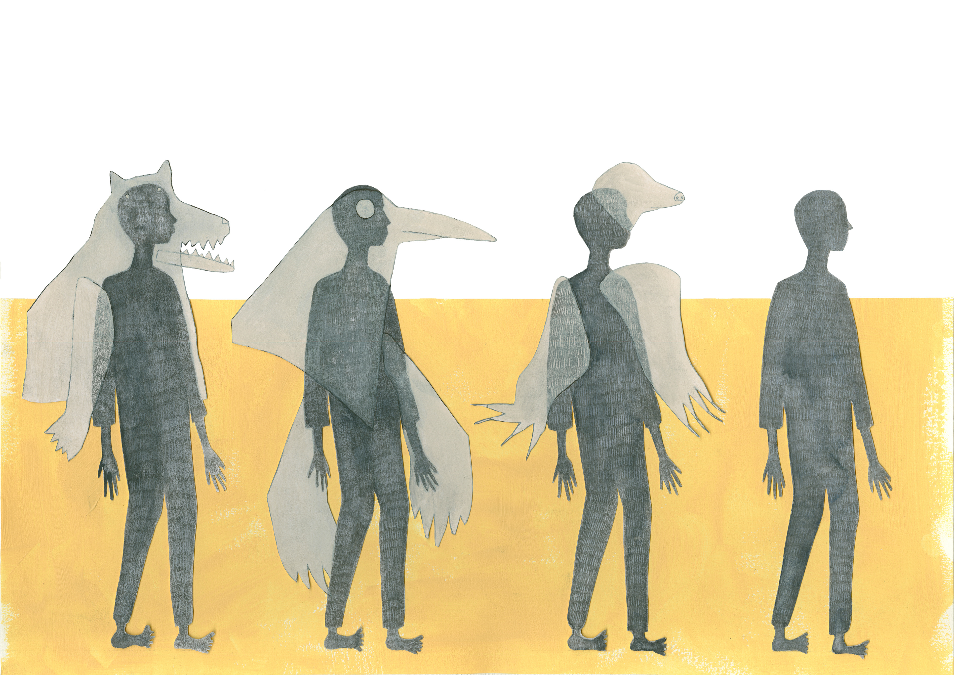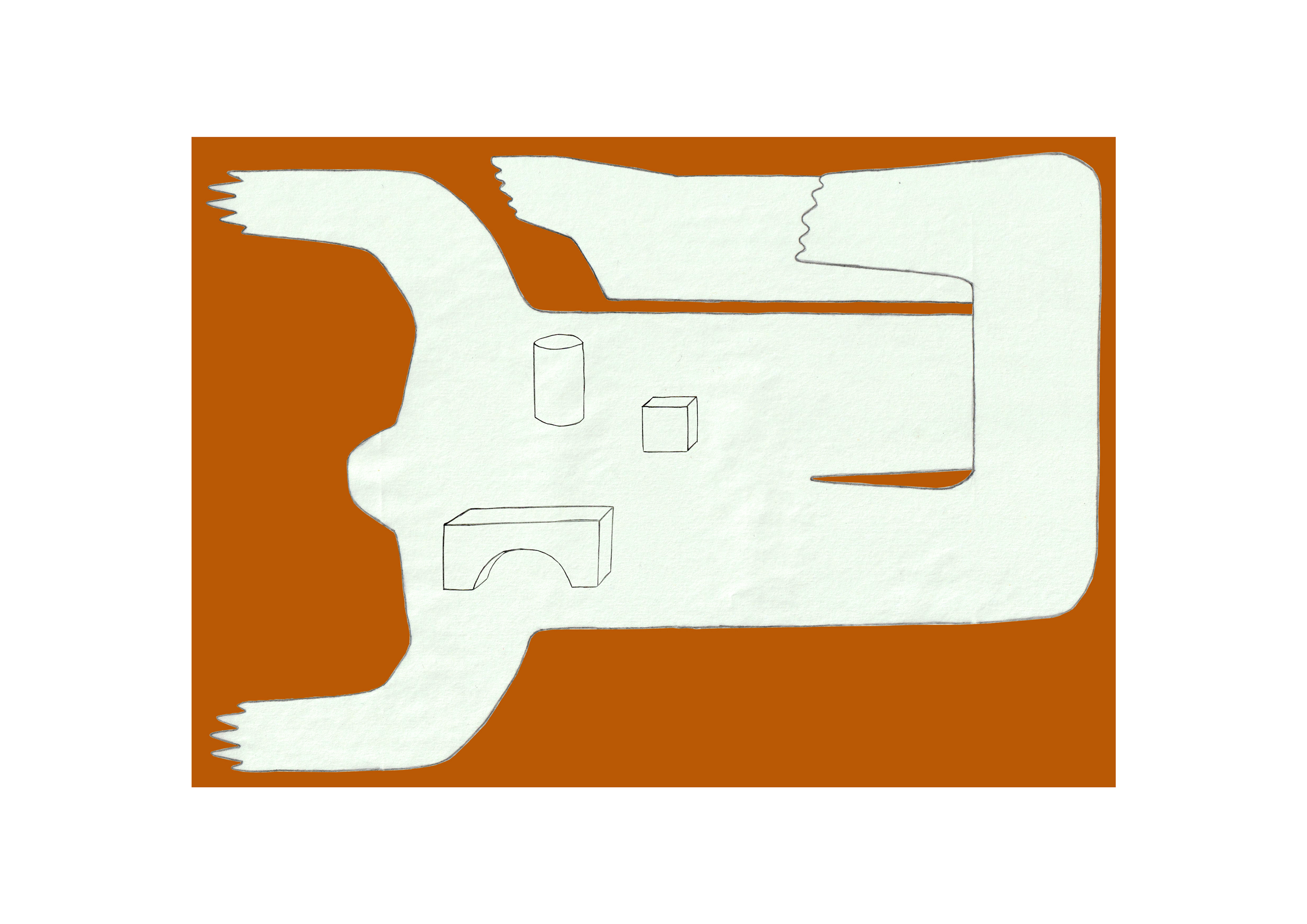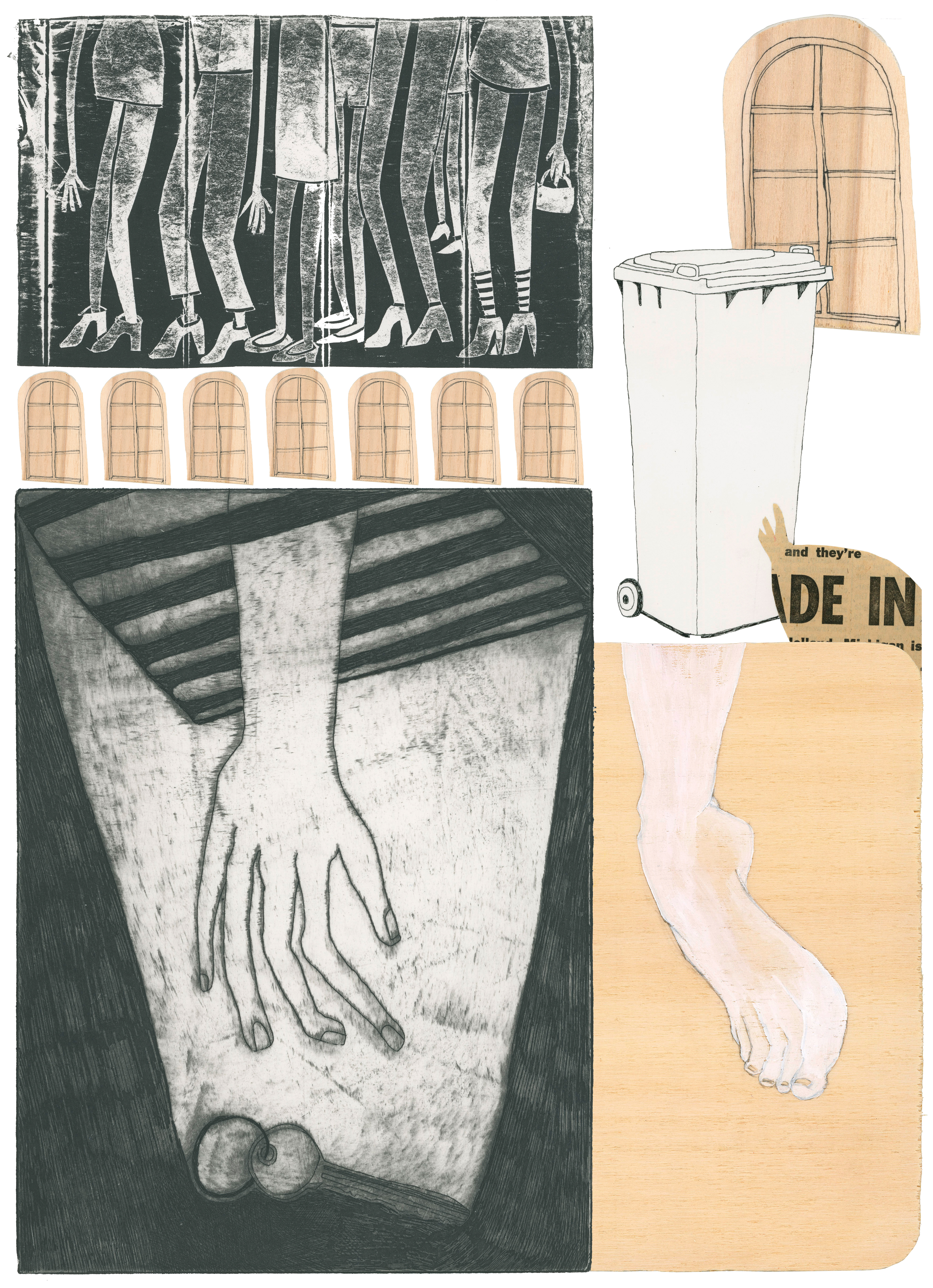 collage van een ets, tetra, potlood, pen en verf op hout en papier
